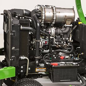 The hood and seat platform open for excellent access to the engine and drivetrain. All daily service points are located on the left side of the machine: