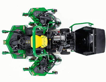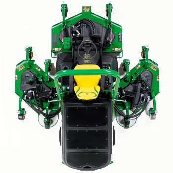 The 1600 Turbo TerrainCut™ WAM is equipped with a 62-in. (157.5-cm) center deck and two 42-in. (106.7-cm) wings. Cutting widths are 128 in. (325.1 cm) using all three decks, 94 in. (238.8 cm) using the center deck and either wing deck, and 62 in. (157.5 cm) with the center deck only. All decks are rear discharge. Wings fold for transport and reduce the machine’s width to a narrow 84 in. (213 cm), so it can easily be driven along golf-cart-size paths or fit on a trailer. The wing decks will float 45 degrees above horizontal and 20 degrees below horizontal, following the ground contour. All decks have a unique baffling system that reduces clumping and provides even clipping dispersal for exceptional appearance.